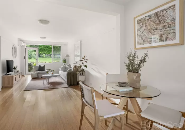 The living space is light-filled and generously proportioned with views of the park over the covered balcony.