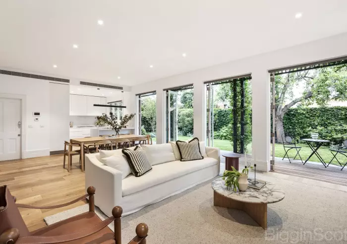 The heart of the home reveals a newly reimagined kitchen, where expansive stone surfaces and premium appointments including Sub Zero fridge and Miele appliances create an environment as practical as it is beautiful. This space flows effortlessly into the voluminous open-plan living and dining area, where French doors frame views of the meticulously landscaped rear garden—a private sanctuary that extends the home’s living space into the outdoors. An adjacent fourth living area or formal dining room exceeds all expectation of this versatile home.