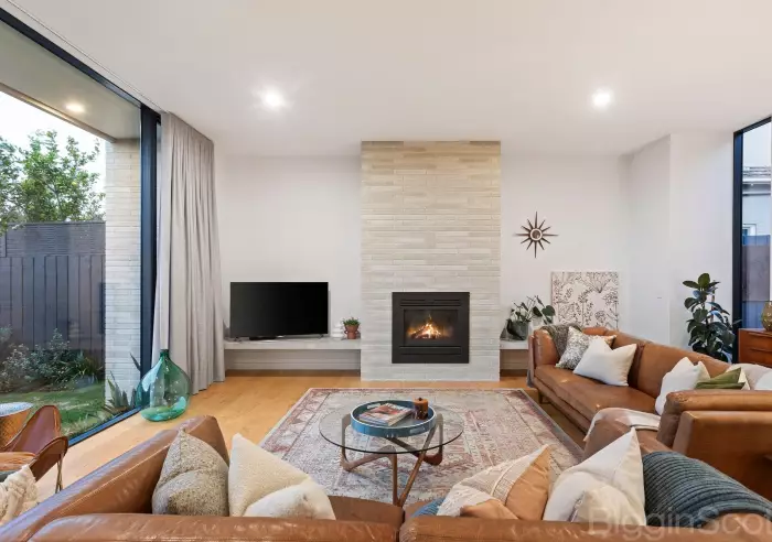 • Superb open plan living with 3-metre high ceilings, feature brick gas log fireplace, and floor-to-ceiling double glazed windows & sliding doors