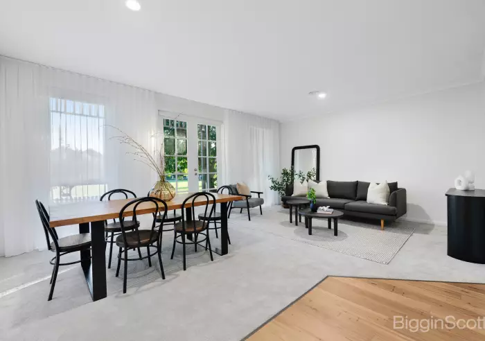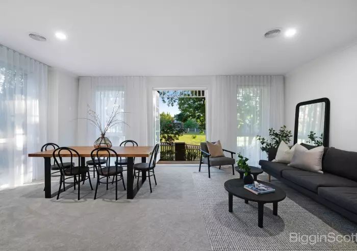 At the heart of the home, a functional and well-sized kitchen connects seamlessly to the open-plan living and dining areas, while the main lounge room, also front-facing, captures tranquil park views.