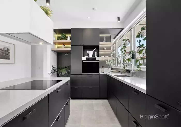 The premium black kitchen is kitted out with 40 soft-close drawers, an entertainers island, quartz countertops, European appliances, servo-drive bins, integrated dishwasher, induction cooktop, sleek ceiling mounted rangehood, pyrolytic wall oven and illuminated shelves.