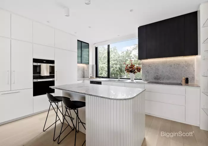- Open plan entertaining zone extending from the chic natural CDK limestone kitchen showcasing premium integrated appliances including a fridge/freezer and Vintec wine fridge complementing the custom cabinetry which flaunts fluted accents on the curved island bench.