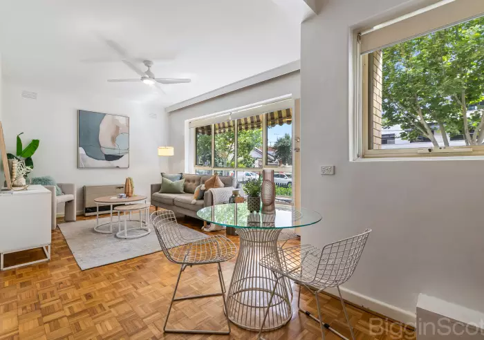 Just moments from the vibrant heart of St Kilda, this beautifully updated 1950s apartment combines timeless character with modern convenience—making it an ideal choice for both lifestyle seekers and savvy investors. Larger than most, it boasts a welcoming entry hall, two generously sized bedrooms with built-in storage, and a spacious living and dining zone perfect for entertaining. The sleek, updated kitchen and sparkling bathroom add contemporary appeal, while polished parquetry floors provide enduring style. Big picture windows flood the home with natural light, complemented by a private balcony and secure car space. With laundry facilities inside the apartment and an unbeatable location—just a short stroll to St Kilda Botanical Gardens, Acland Street, the foreshore, and only 15 minutes’ walk to Balaclava train station—this property promises strong rental demand and long-term capital growth. Currently projected to achieve approximately $650 per week in rental income, this is an opportunity not to be missed for investors and owner-occupiers alike.