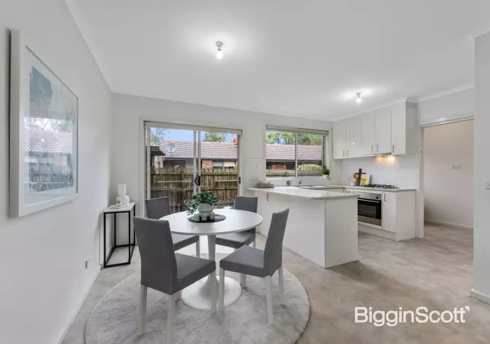 Step inside to discover a spacious open plan living and dining zone bathed in natural light, flowing effortlessly to a private grassed courtyard, perfect for entertaining, summer BBQs or simply relaxing in your own peaceful retreat.The stylish kitchen is sure to impress, featuring sleek tiled splashbacks, stainless steel appliances including a gas cooktop and oven, generous bench space, and excellent storage throughout.