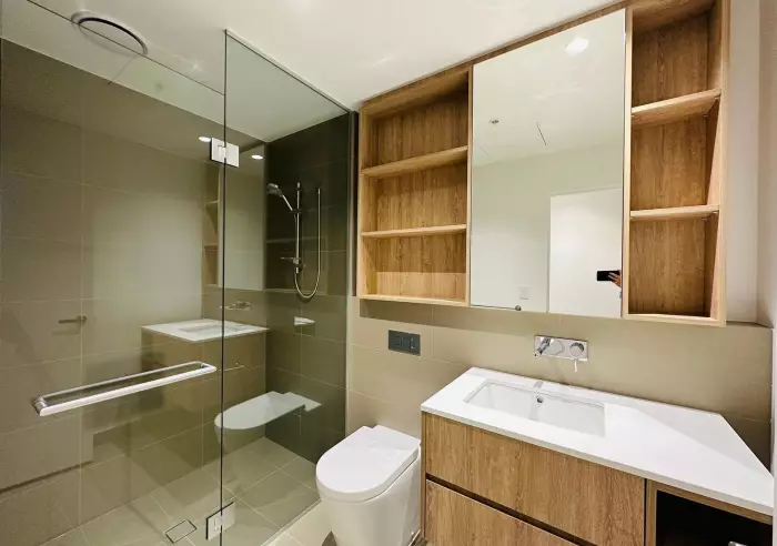 Expansive floor-to-ceiling glazing allows abundant natural light to pour into the delightful living room with glamorous stone kitchen fitted with premium appliances. Full-height tiling complements the suave bathroom and ensuite (with bathtub) while the bedrooms feature large built-in robes.