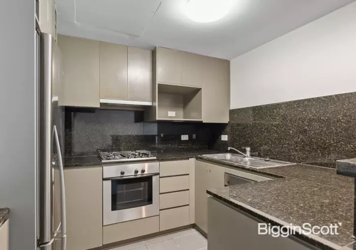 Two spacious bedrooms adorned with mirrored built-in robes provide sanctuary and organization. Step out onto the expansive balcony and soak in the open city vistas – a perfect retreat to unwind after a busy day. Additional luxuries include ducted air conditioning and heating, intercom security.