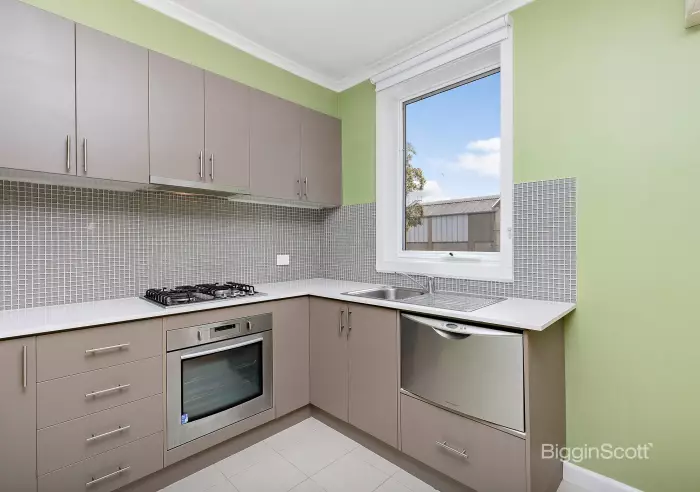 - Contemporary kitchen with stone benchtops and stainless steel appliances, including a gas cooktop and dishwasher