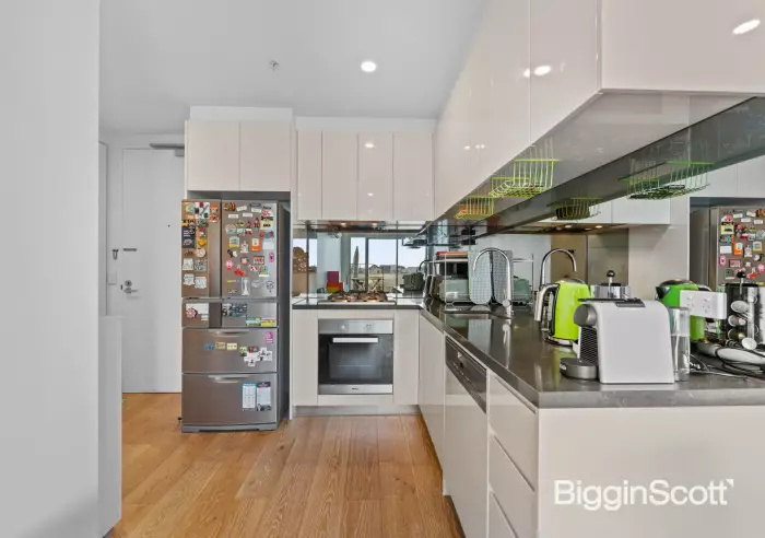 Bathed in natural light, the generous open-plan living and dining area is enhanced by warm timber flooring and seamless flow to the expansive balcony—ideal for morning coffees, weekend entertaining, or simply unwinding while soaking in the spectacular scenery. The sleek, well-designed kitchen features premium Miele appliances including gas cooktop, dishwasher, oven, stone benchtops, and mirrored splashbacks for an elegant touch.