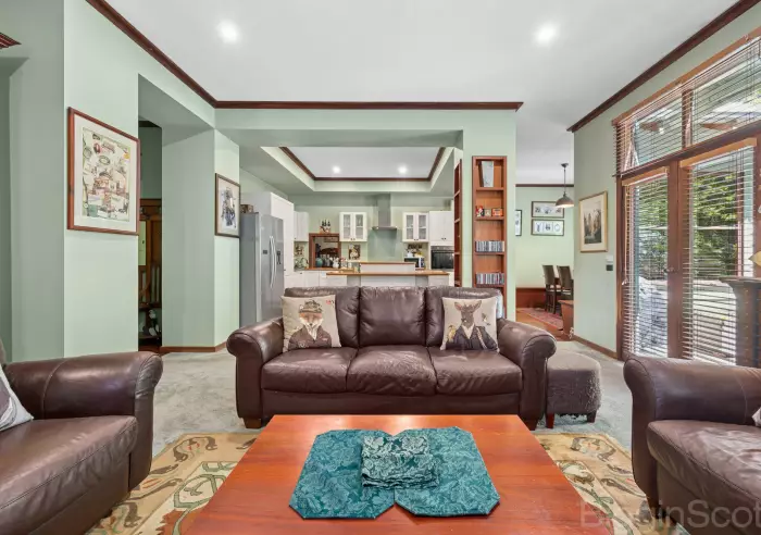 Expansive timber decks — jarrah at the front and spotted gum at the rear — provide generous spaces for relaxation and entertaining. The rear deck is enhanced by a large retractable awning, transforming the area into an all-weather alfresco perfect for BBQs and gatherings while enjoying the uninterrupted outlook to the native forest.