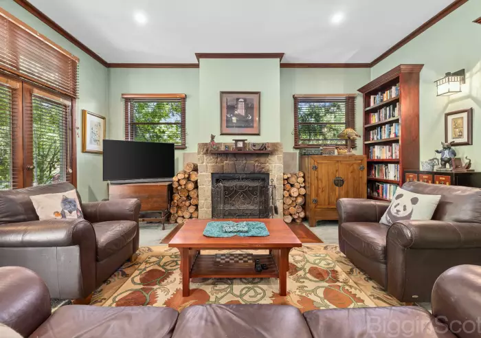 Outdoors, the Japanese-influenced landscaping features clipped shrubbery, sculptural plantings and a captivating array of rare trees and maples. The dedicated study overlooks the front garden and includes custom-built-in shelving, creating an ideal work-from-home environment in a tranquil, leafy setting.