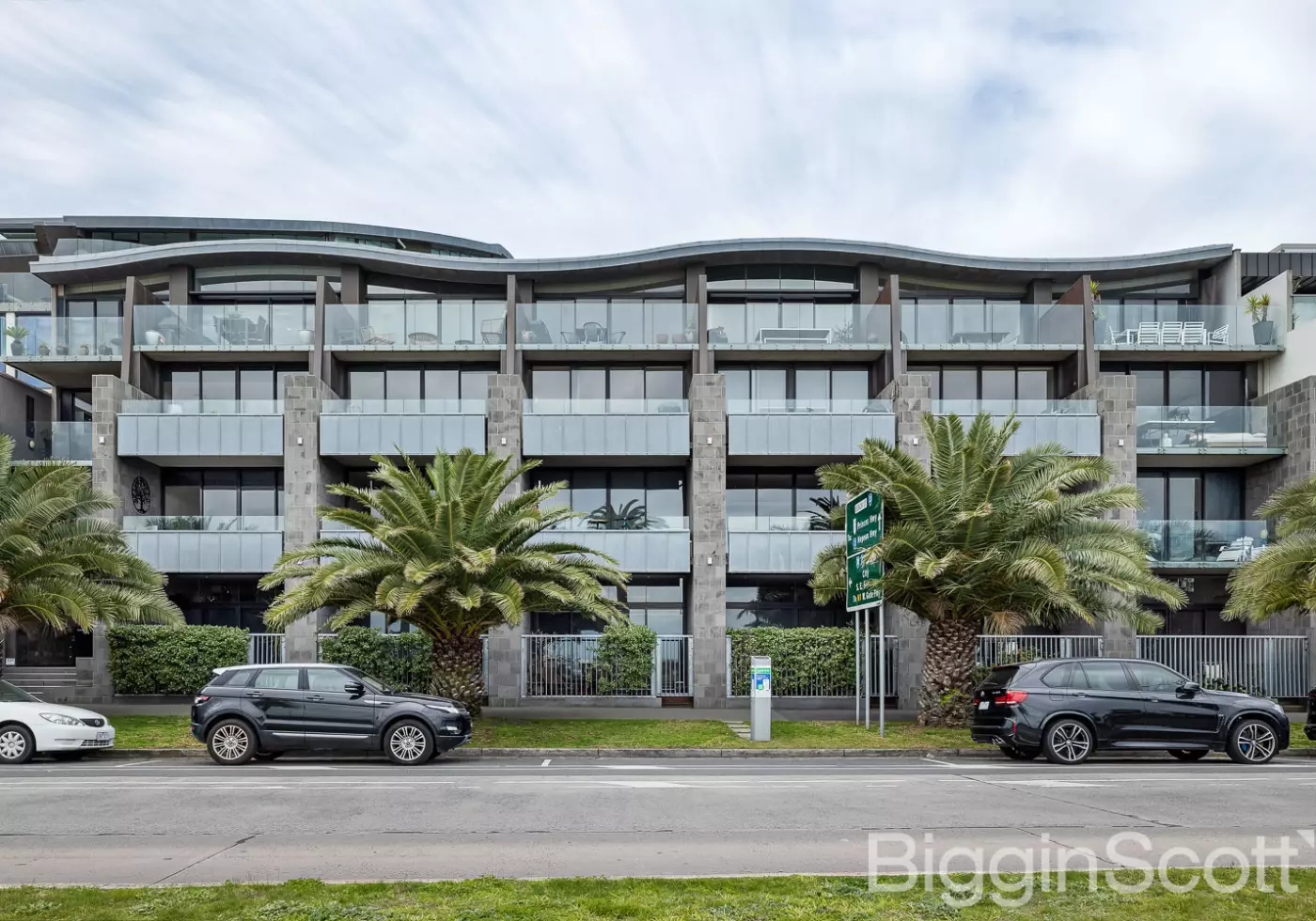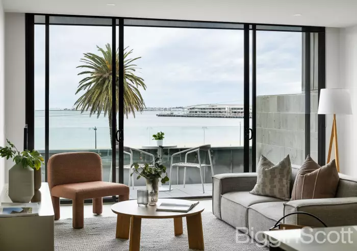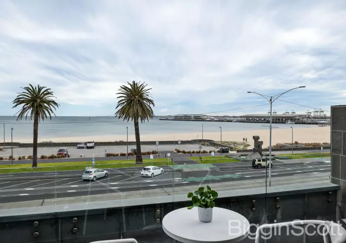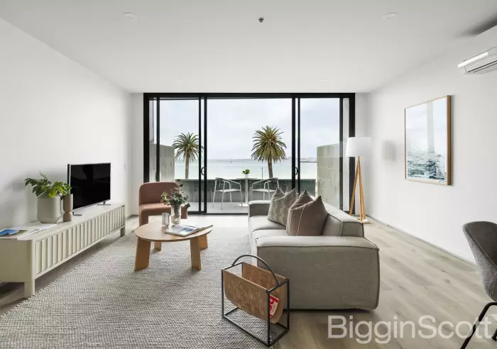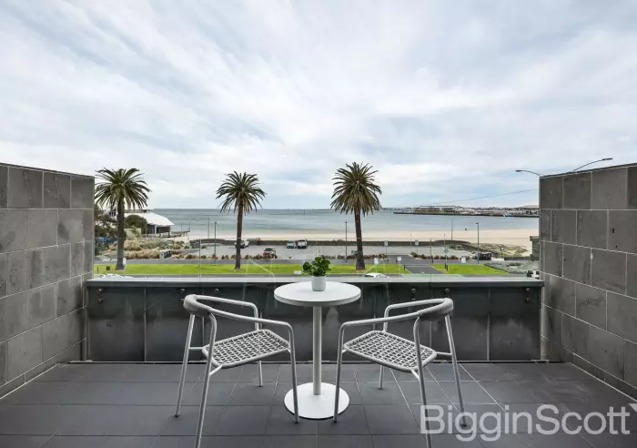 With uninterrupted views stretching across the sand and sea, this stunning two-bedroom, two-bathroom residence in the exclusive 'Aqua Vita' building offers one of Port Melbourne's most captivating waterfront positions. From the moment you step inside, the ever-changing coastline becomes your daily backdrop—morning light dancing on the bay, golden sunsets over the horizon, and the soothing rhythm of waves just beyond your balcony. Designed for elegant, low-maintenance living, the home opens with a wide entry hall and beautiful new timber floors that lead to an open-plan living and dining zone bathed in natural light. The expansive layout flows seamlessly onto a private terrace—ideal for alfresco dinners or quiet moments soaking up the ocean breeze. At the heart of the home, the kitchen impresses with stone benchtops, an island with breakfast bar, and high-quality Miele appliances, offering both form and function for the modern entertainer. The clever floorplan enhances privacy, with each bedroom positioned on either side of a tranquil internal atrium. The generous master retreat includes a walk-in wardrobe and stylish ensuite, while the second bedroom is serviced by a beautifully finished second bathroom with integrated laundry. With reverse cycle heating and cooling, secure video intercom, lift access, two basement car spaces and a separate storage cage, this residence delivers comfort and convenience at every turn. Located just steps from the beach and Bay Street's lively dining and retail scene, and moments from Gasworks Arts Park, South Melbourne Market and the 109 light rail, this is a rare opportunity to secure true beachfront luxury—where lifestyle, location and timeless design come together.