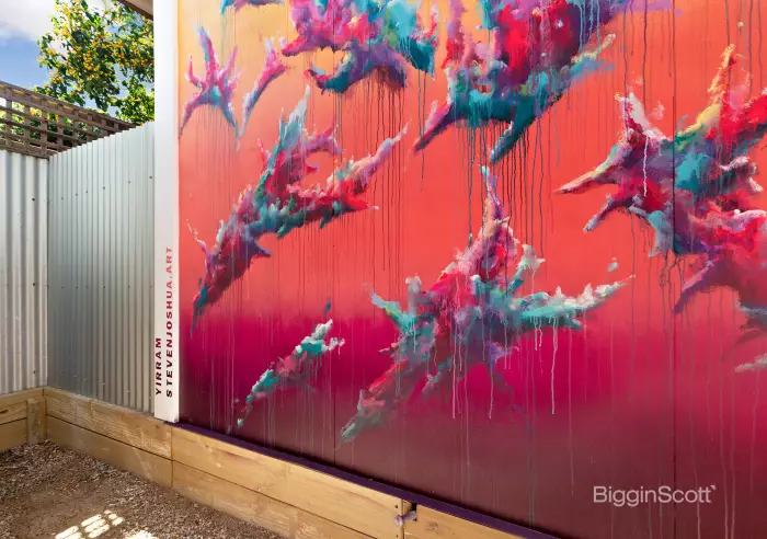 A stunning 3x4m mural by artist Steven Joshua anchors the space, infusing personality and soul into every corner.