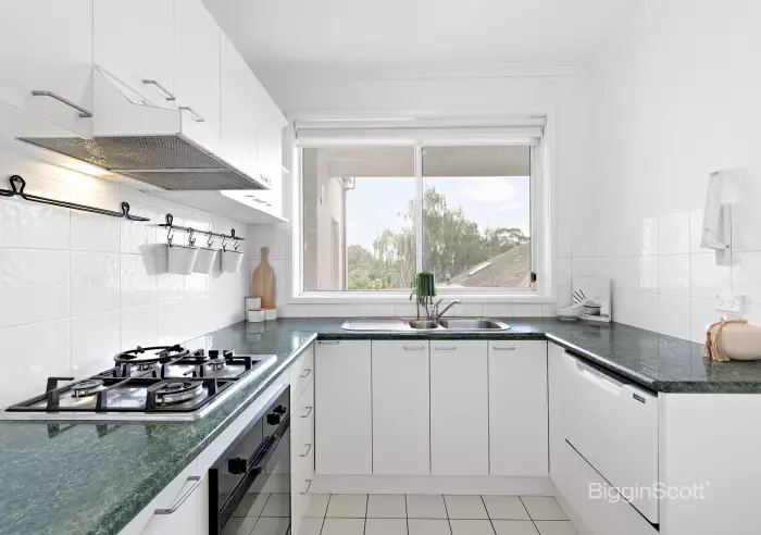 - A gas cooktop and dishwasher are highlights of the bright and sunny kitchen, which also boasts ample cupboard and preparation space.