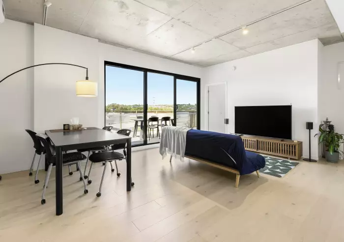 Completed in 2020, the apartment showcases a thoughtfully designed floorplan complemented by quality finishes throughout. Both bedrooms are well-proportioned and include built-in robes, with the main bedroom featuring its own private ensuite. A bright open-plan living and dining zone extends effortlessly to a private balcony, creating an ideal space for relaxing or hosting guests. The oversized, contemporary kitchen is appointed with stone benchtops, stainless steel appliances, and generous storage, making it equally suited to casual dining or entertaining. Additional features include a European-style laundry, reverse-cycle heating and cooling, and the rare advantage of two secure car spaces.