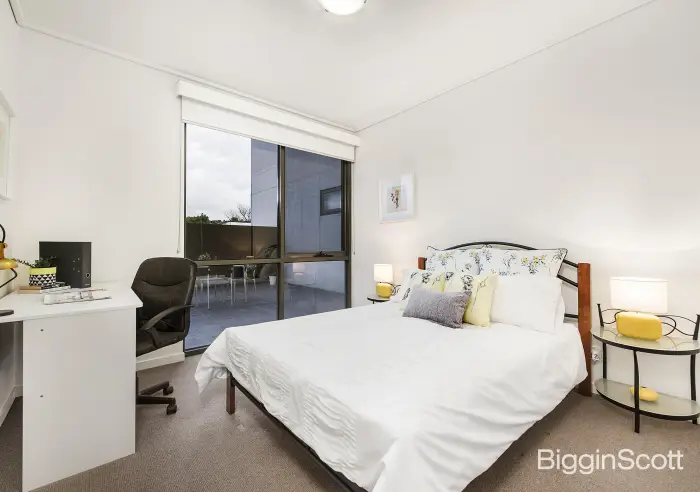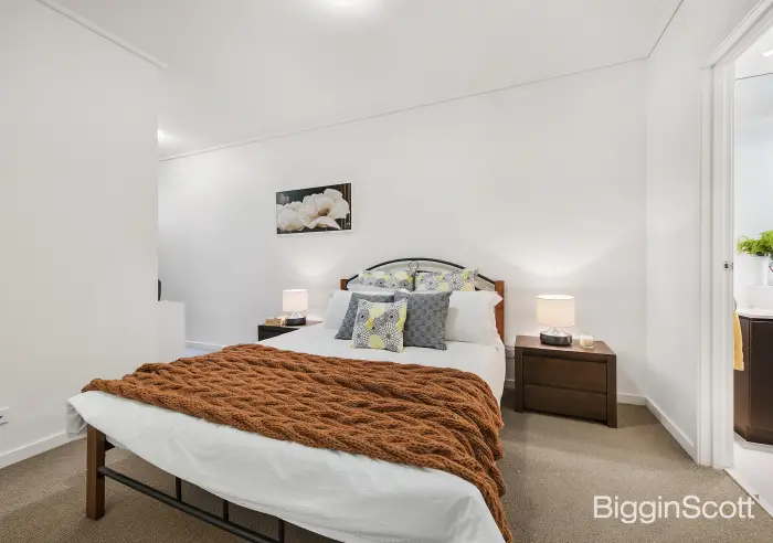 The large master bedroom comes with a study nook, built-in robes, and its own private ensuite, while the 2nd bedroom has plenty of light as well as BIRs. Other apartment extras include a chic central bathroom, European laundry, reverse cycle heating and cooling, video intercom entry, and a single undercover car space.