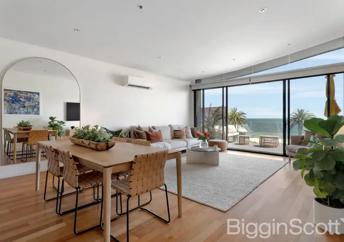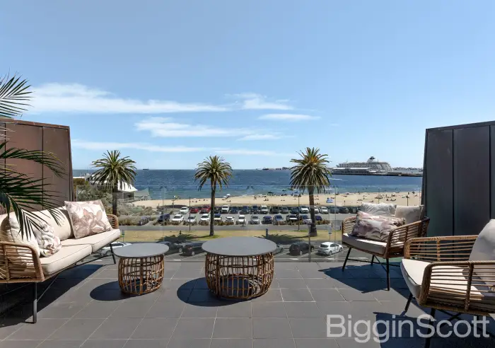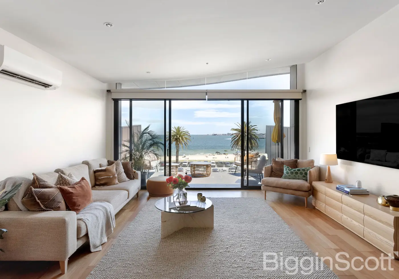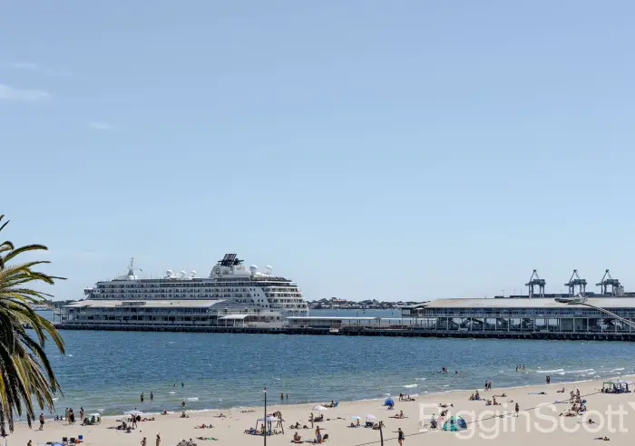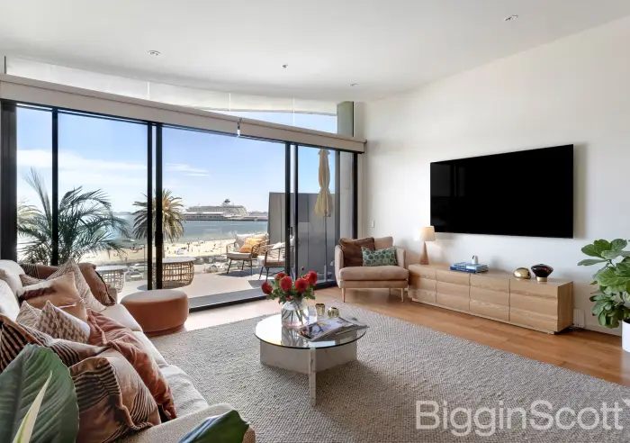 Wake up to expansive views across the bay and Port Melbourne Beach from your private balcony, where morning light, open skies, and calm evenings become part of everyday living. Positioned on the 4th floor and set back perfectly from the street, this exceptional apartment captures striking water and sand views while remaining quiet, private, and free from traffic noise.