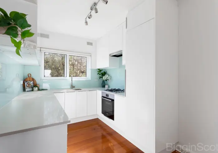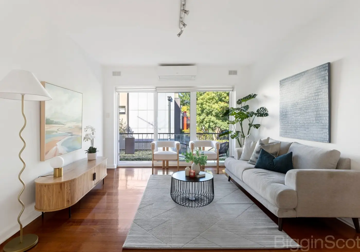 Two impeccably fitted bedrooms provide peaceful retreats, while thoughtful touches throughout—reverse-cycle air-conditioning, double-glazed European windows, neutral décor—elevate everyday living.