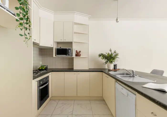 • Full-size U-shaped kitchen fitted with oven, gas cooktop, dishwasher, excellent storage and generous bench space