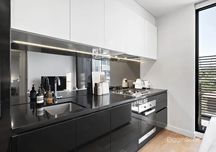 - Sleek and modern kitchen appointed with stone benchtops, gas cooktop, stainless-steel appliances, excellent storage, and a discreet European laundry for everyday convenience.