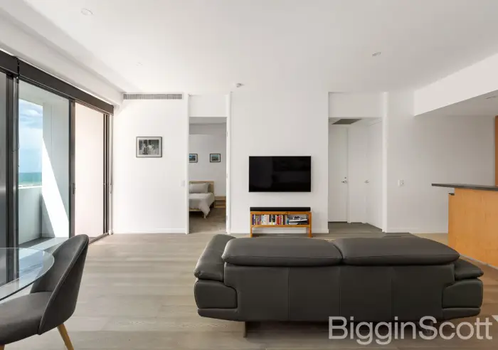 The apartment itself showcases a highly functional and generous layout, with open plan living and dining areas flowing seamlessly to a full width balcony that captures impressive beach views. The kitchen is designed for effortless everyday living, while the accommodation is thoughtfully zoned for privacy. The main bedroom is complemented by its own ensuite, whilst the second bedroom is serviced by a central second bathroom, ideal for guests or a home office.