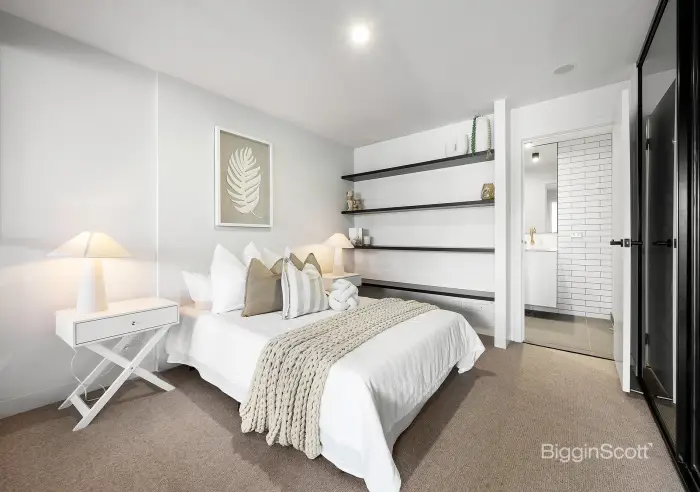 Relaxed, light filled bedroom: With direct terrace access, the bedroom provides plenty of natural light, creating a calm and comfortable space. It also features excellent mirrored built-in robes, display shelving, and ensuite access to a modern bathroom.