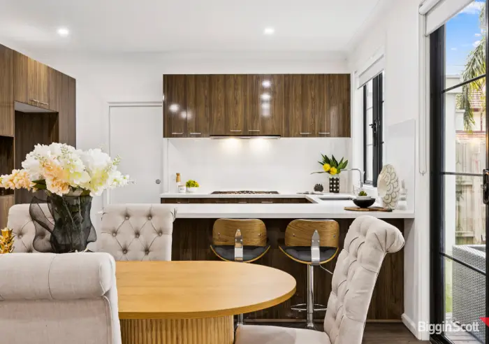 A sophisticated neutral colour palette and stylish tones create a warm, inviting atmosphere throughout. The light-filled open-plan living and dining area seamlessly connects to a stunning stone-benched kitchen, featuring expansive workspace, sleek Miele appliances, and abundant storage. Sliding doors extend the living space to a north-facing deck, ideal for effortless indoor-outdoor entertaining.