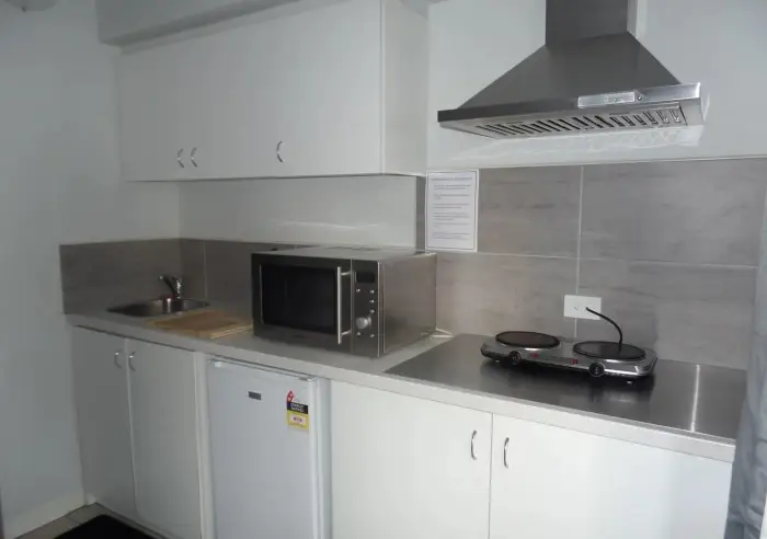 • Kitchen with cooktop, microwave, refrigerator, and ample storage
