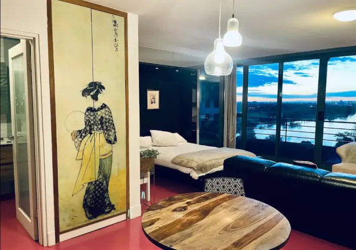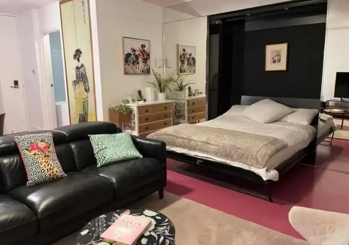 If you like a splash of colour here and there, you will be impressed by the mulberry coloured brand new polished concrete floors, renovated duck blue herringbone design bathroom with bath over shower and gold designed tapware with vanity. The apartment also features full length mirrored built in wardrobes with fold away New York style bed (ideal for when you want to fold it away and create additional space.)