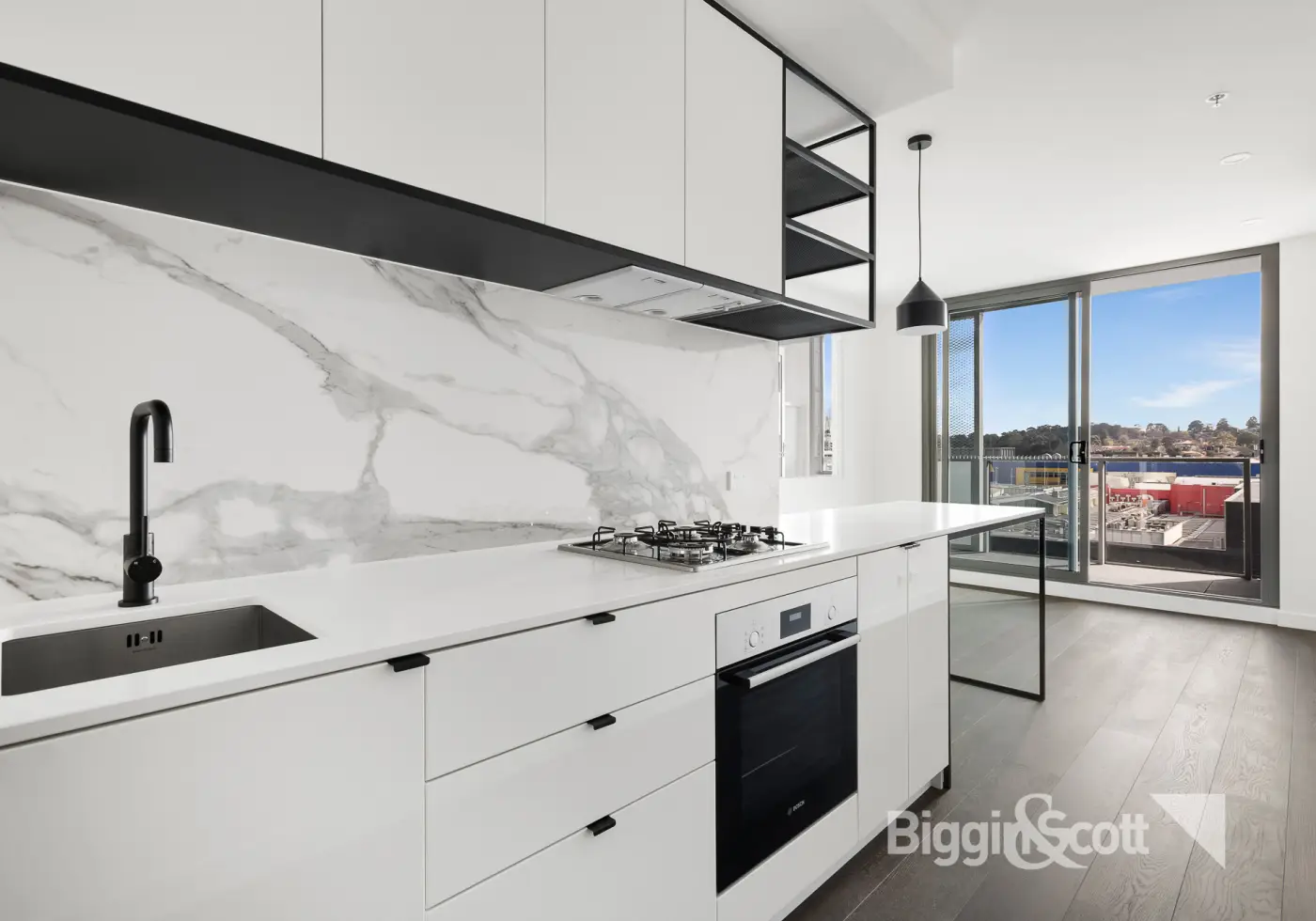 - Open plan kitchen and living space with floating timber floors, glass doors to balcony and split system heating/cooling
