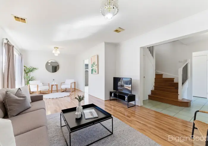 The home flows seamlessly to a private outdoor courtyard, creating an inviting setting for weekend barbecues, morning coffee in the sun, or quiet evenings with friends and family. A well-appointed bathroom on the ground floor adds practicality and flexibility for guests or multi-generational living.