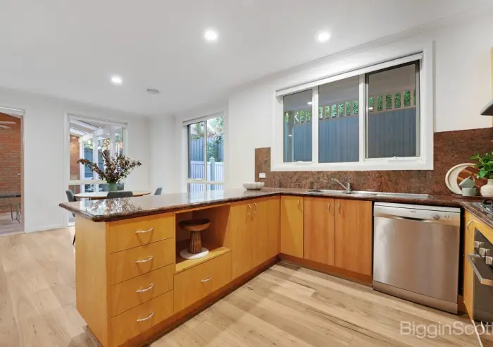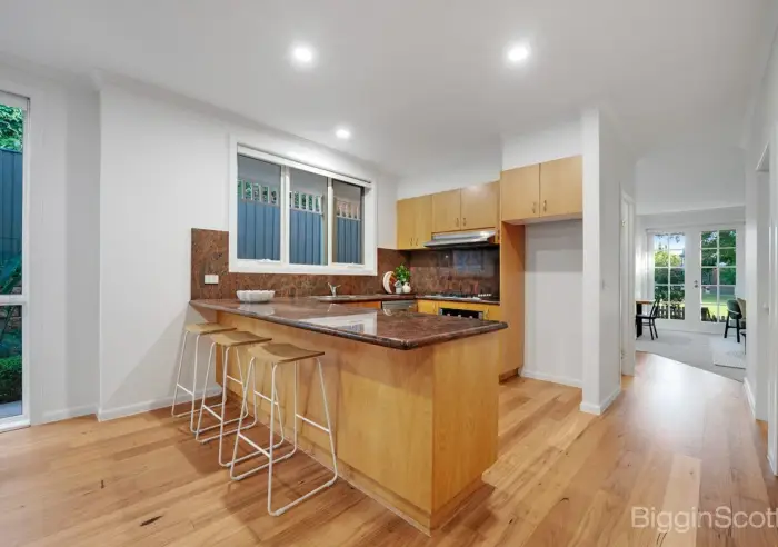 A functional, well-appointed kitchen flows seamlessly into the open-plan living and dining area, while the front-facing lounge room captures calming park outlooks.