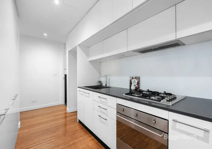 - Sleek monochrome kitchen appointed with stone benchtops, gas cooktop, integrated dishwasher, excellent cabinetry and dedicated pantry storage.