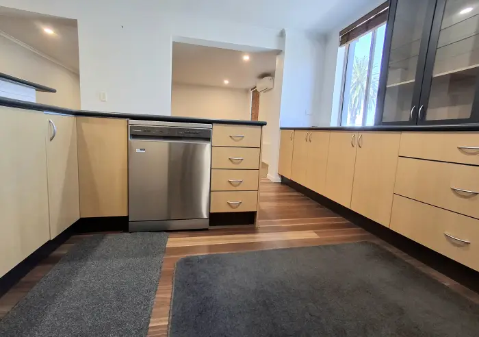 The light-filled kitchen is equipped with near-new appliances including a dishwasher, ample cupboard storage, and overlooks the adjoining meals area. A generous living space provides year-round comfort with split-system heating and cooling.
