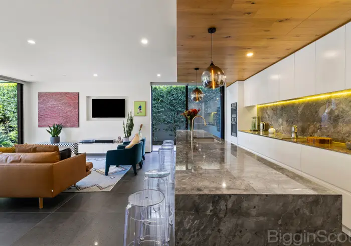 Hard to find and in an exceptional development, it is just a short stroll away from Elwood Village, the beach, and adjacent to Elsternwick Park. The journey begins with your very own and bespoke private entry via Ormond Road, through the amazing decked and landscaped garden and then into a sea of open living, perfect for lovers of space and for those who love to entertain with family and friends in mind, the family room offering living, dining, the biggest of benches and tranquil aspects everywhere you look.