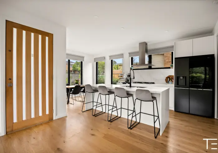 Thoughtfully designed for modern family living, the residence showcases a spacious living and dining area filled with natural light, connecting to a stunning stone kitchen complete with a large island bench, quality appliances and abundant storage.