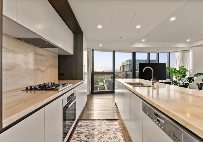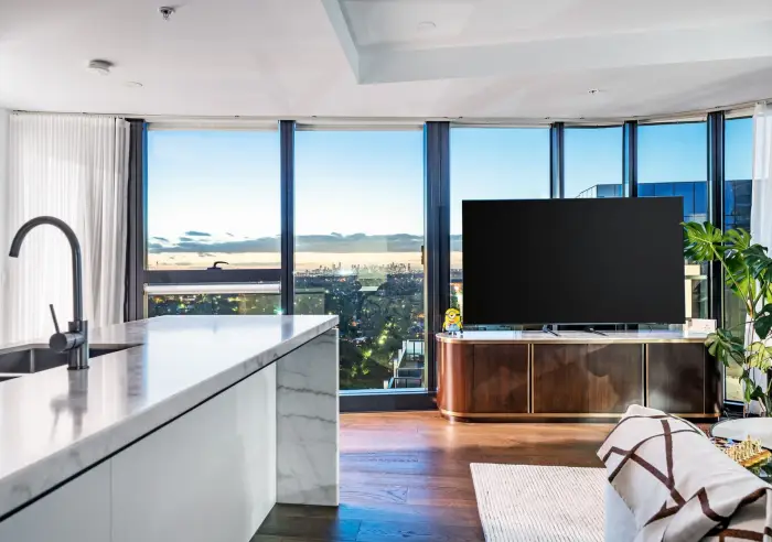 apartment offers elevated living with breathtaking views across Melbourne’s skyline. Designed for