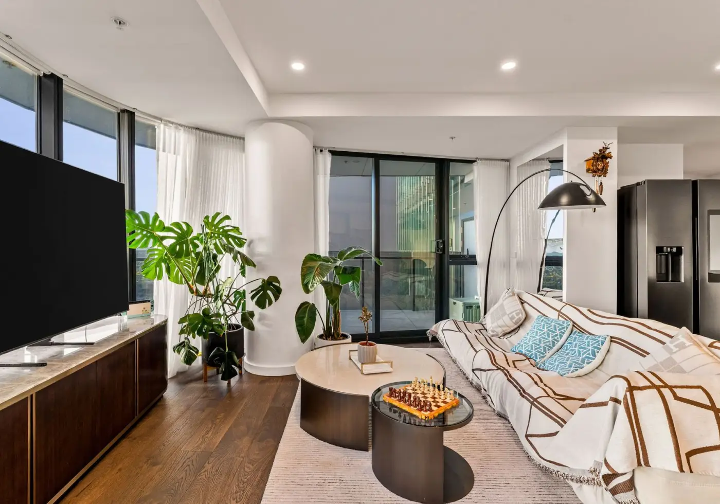 CBD and metropolitan views. Floor-to-ceiling glass doors extend the space onto a private balcony,