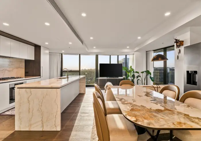 The kitchen showcases elegant marble stone benchtops with a waterfall island that doubles as a