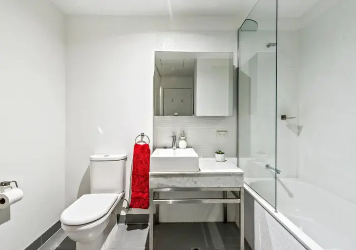- Central bathroom featuring a shower over bath, stone benchtop vanity, mirrored cabinetry.