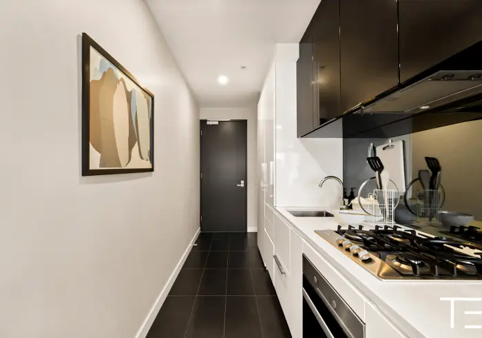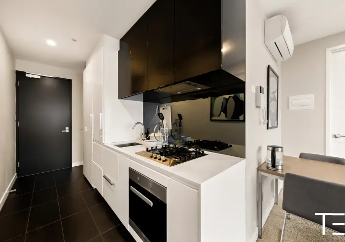 The kitchen runs neatly along one side with everything within reach - gas cooking, good storage, and clean finishes that still feel current. It connects naturally to the living area, so it never feels boxed in.