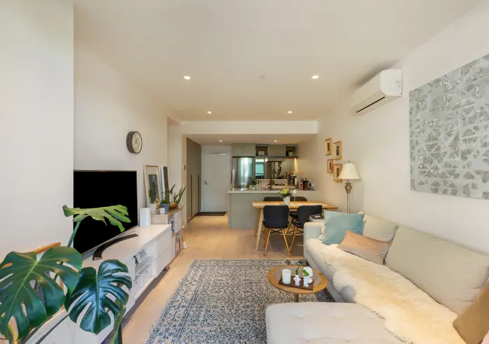 Both bedrooms are generously sized and fitted with built-in robes, while the master suite includes a stylish ensuite and dedicated study desk—perfect for working from home. A contemporary central bathroom, European laundry, and a south east facing balcony further enhance the home’s comfort and functionality.