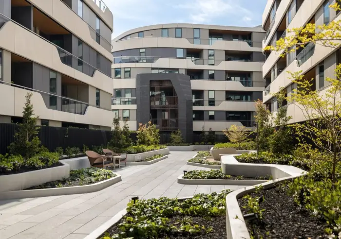 Residents enjoy exclusive access to resort-style amenities including a sky pool with stunning city views, fully equipped gym, wellness centre, yoga studio, massage rooms, rooftop dining spaces, and beautifully landscaped gardens designed by Jack Merlo.