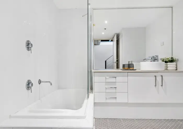 - Stylish bathroom with shower over bath and European laundry