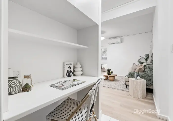 - The good-sized bedroom has the convenience of a generous wardrobe. A handy study nook with desk is also offered – perfect for those working from home.
