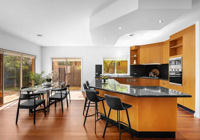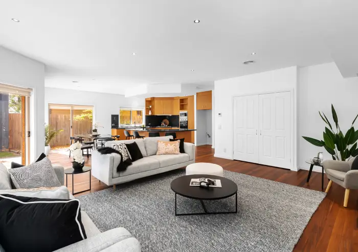 Open-plan living area,  floorboards that flow seamlessly throughout the space. The sunken living room adds a unique touch, creating a cozy yet stylish environment for relaxation and entertaining. The kitchen is equipped with high-quality integrated appliances, including a Westinghouse oven, Panasonic microwave, and Miele dishwasher, making it a chef's delight. The large separate laundry with outdoor access.