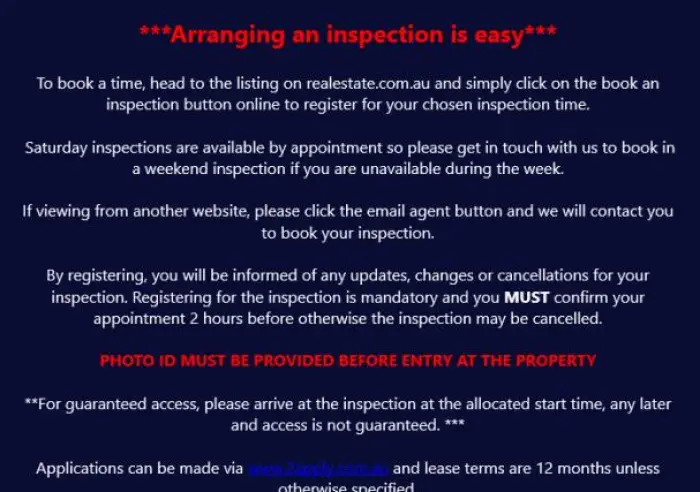 To book a time, head to the listing on realestate.com.au and simply click on the book an inspection button online to register for your chosen inspection time, Saturday inspections are available by appointment so please get in touch with us to book in a weekend inspection if you are unavailable during the week. If viewing from another website, please click the email agent button and we will contact you to book your inspection. By registering, you will be informed of any updates, changes or cancellations for your inspection. Registering for the inspection is mandatory and you MUST confirm your appointment 2 hours before otherwise the inspection may be cancelled. PHOTO ID MUST BE PROVIDED BEFORE ENTRY AT THE PROPERTY. **For guaranteed access, please arrive at the inspection at the allocated start time, any later and access is not guaranteed.***