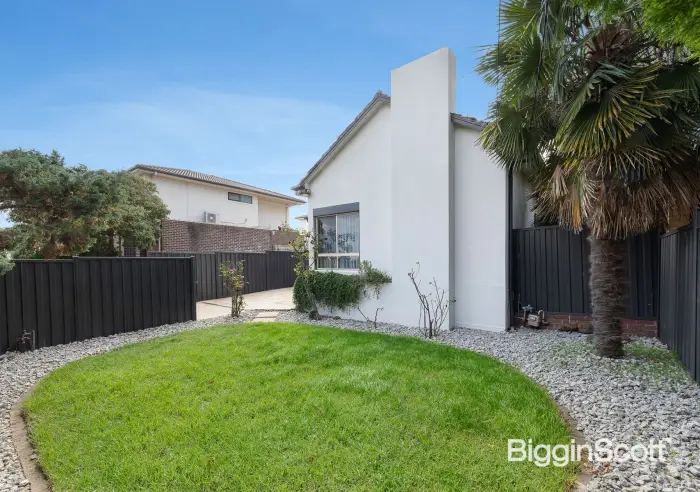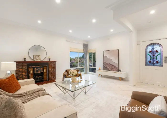 In the front yard, a lush lawn area provides space for young children to play in the secure yard with windows from the lounge room overlooking the space and a decorative fireplace adding a timeless elegance.