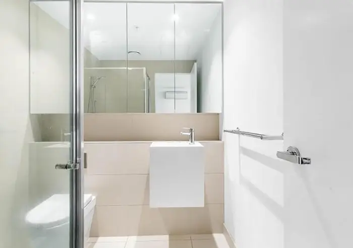 Sleek central bathroom with walk up shower and good storage