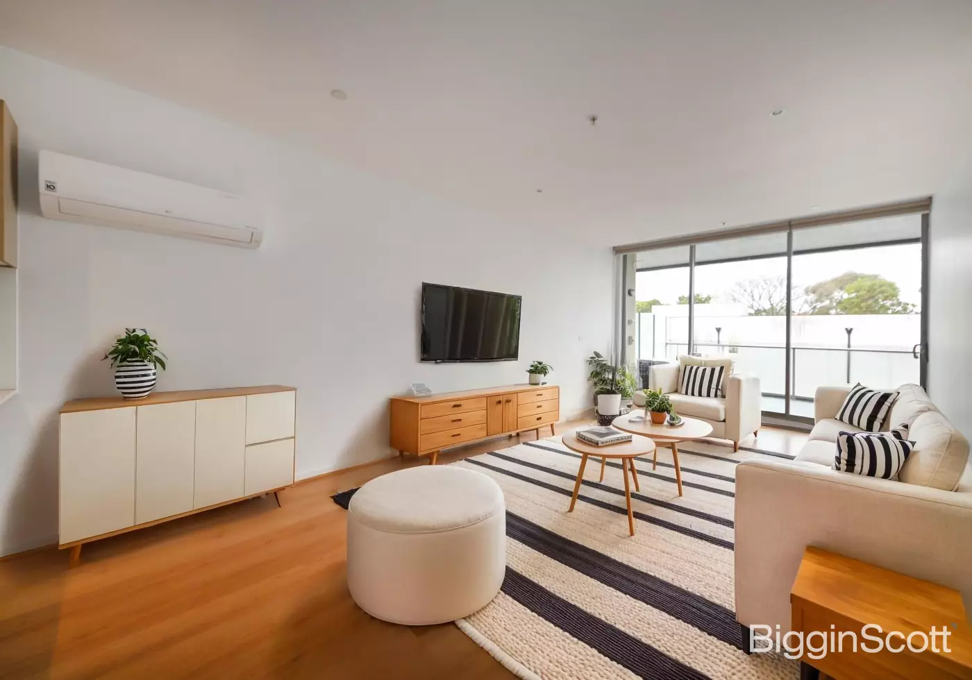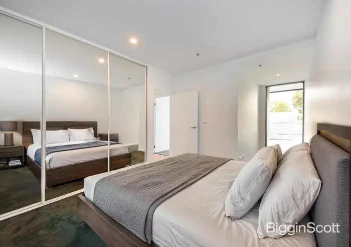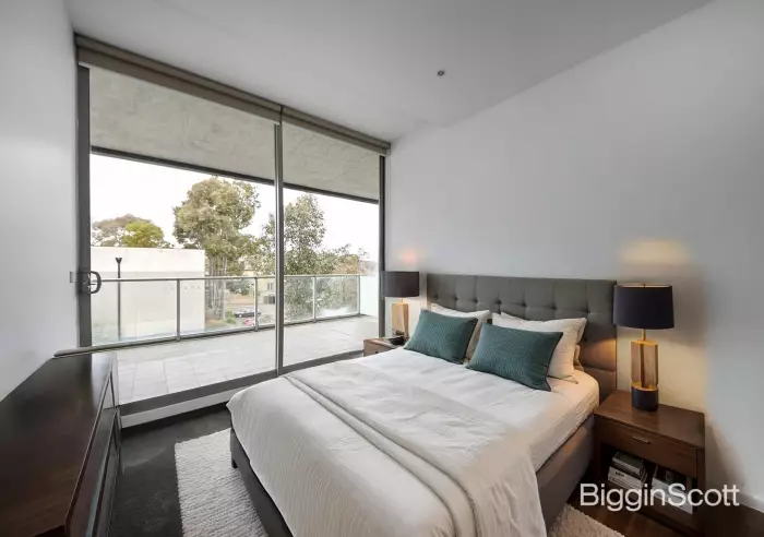 The large master bedroom comes with a study nook, while the 2nd bedroom has plenty of light as well as BIRs. Other apartment extras include a chic central bathroom, European laundry, reverse cycle heating and cooling, video intercom entry, and a single undercover car space.
