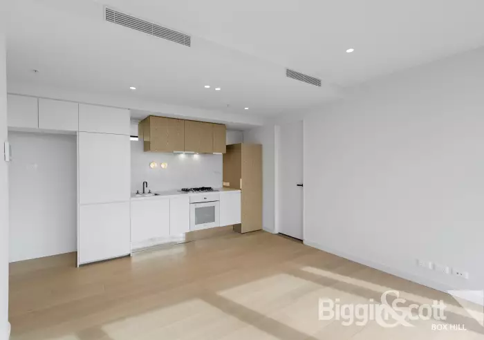 The heart of the home is the open-plan kitchen, equipped with premium Miele appliances, sleek cabinetry, and ample bench space. The adjoining living and dining area is bathed in natural light, offering a warm and inviting atmosphere with sweeping views of Melbourne’s vibrant cityscape.